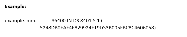 - Delegation signer (DS) record to allow the transfer of trust from the parent zone to the child zone.