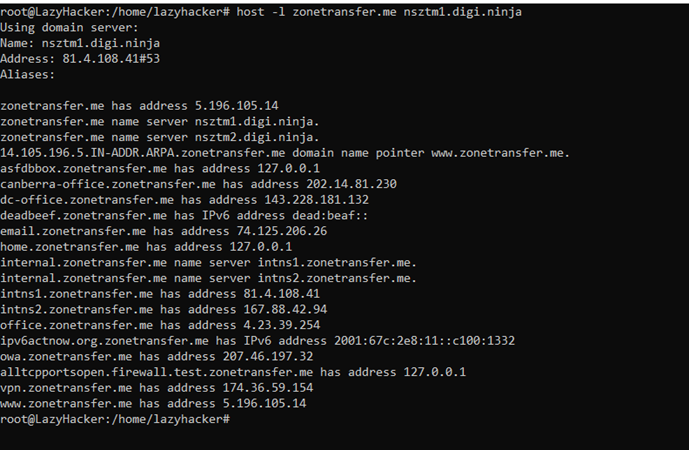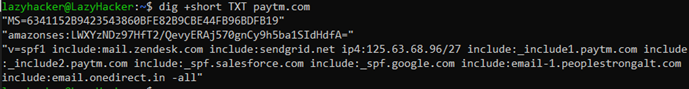 An adversary uses this information to understand the organization’s infrastructure, IP addresses, third-party email services, internal netblocks, and subdomains. The SPF record is defined using the TXT record. So, whenever one searches for the SPF record, it should be searched by the TXT record.